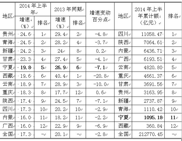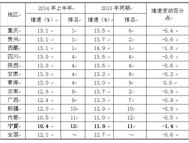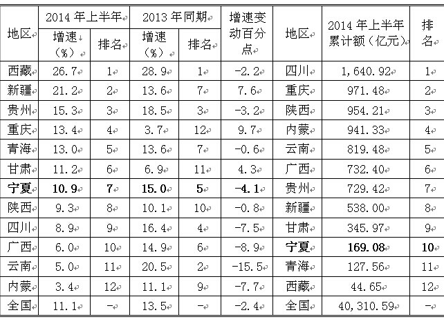 2014年上半年,我国经济仍面临较大的下行压力,西部地区各项经济指标延续了上年以来的低位增长态势,各项主要经济指标对比如下: