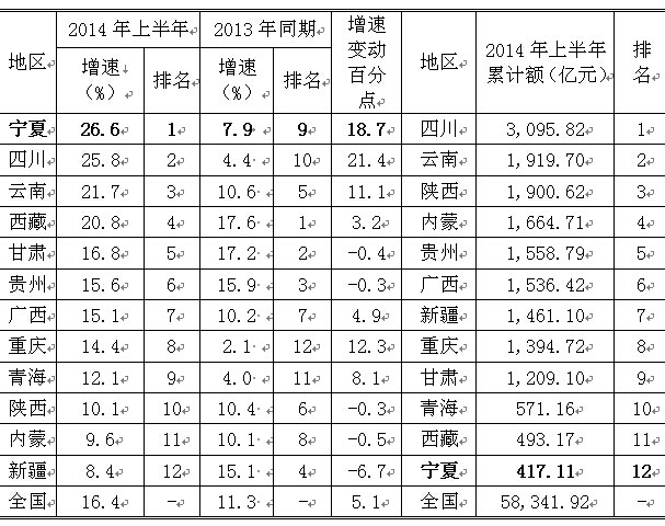 2014年上半年西部地区固定资产投资对比表