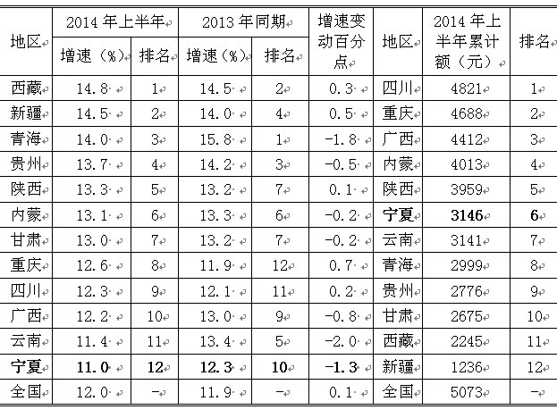 2014年上半年西部地区农村常住居民人均可支配收入对比表